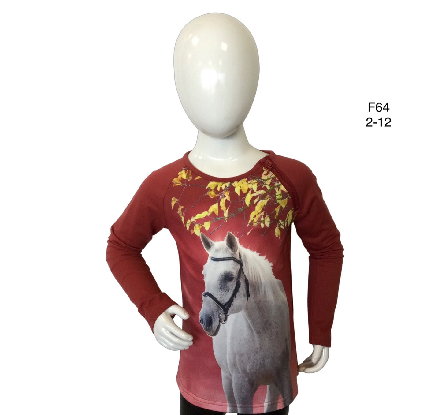 Girls sweater / shirt with long sleeves and a horse print in the color dark red. The sweater has a decorative zipper that runs from the neck along the sleeve. Available in various variants.