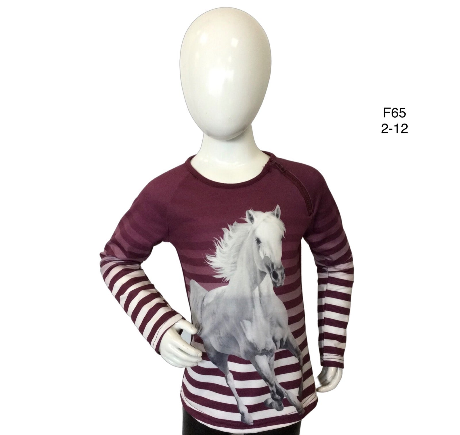 Girls sweater / shirt with long sleeves and a horse print in the color wine red. The sweater has a decorative zipper that runs from the neck along the sleeve. Available in various variants.